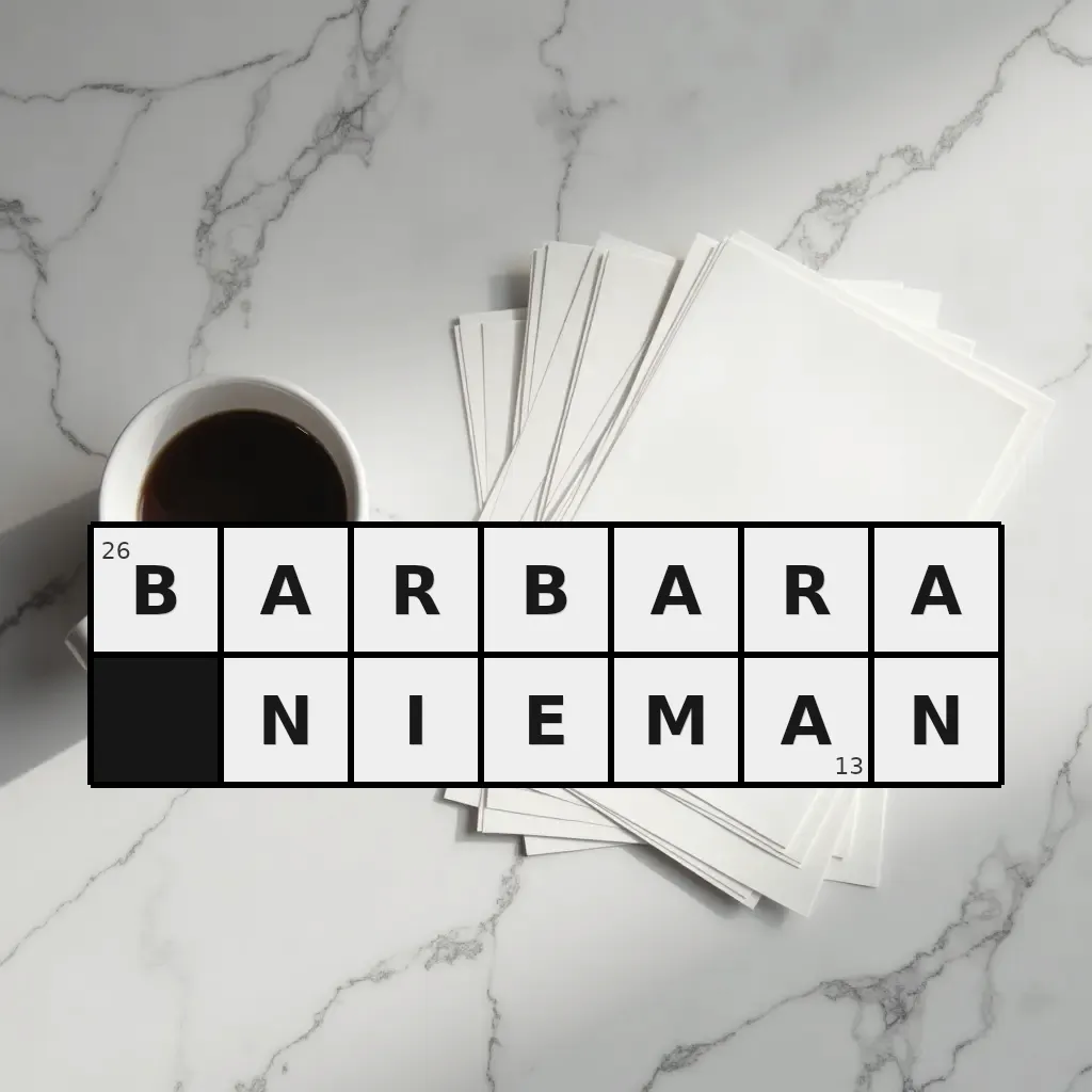 Słowo „barbara nieman” ma 13 znaków (bez spacji i łączników).