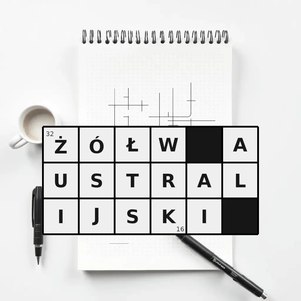 Słowo „żółw australijski” ma 16 znaków (bez spacji i łączników).
