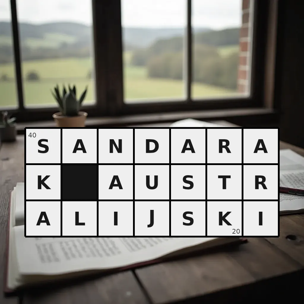 Słowo „sandarak australijski” ma 20 znaków (bez spacji i łączników).