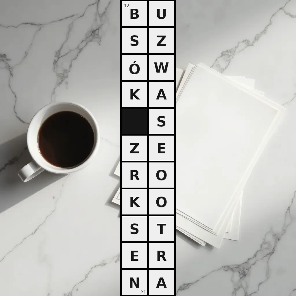 Słowo „buszówka szerokosterna” ma 21 znak (bez spacji i łączników).