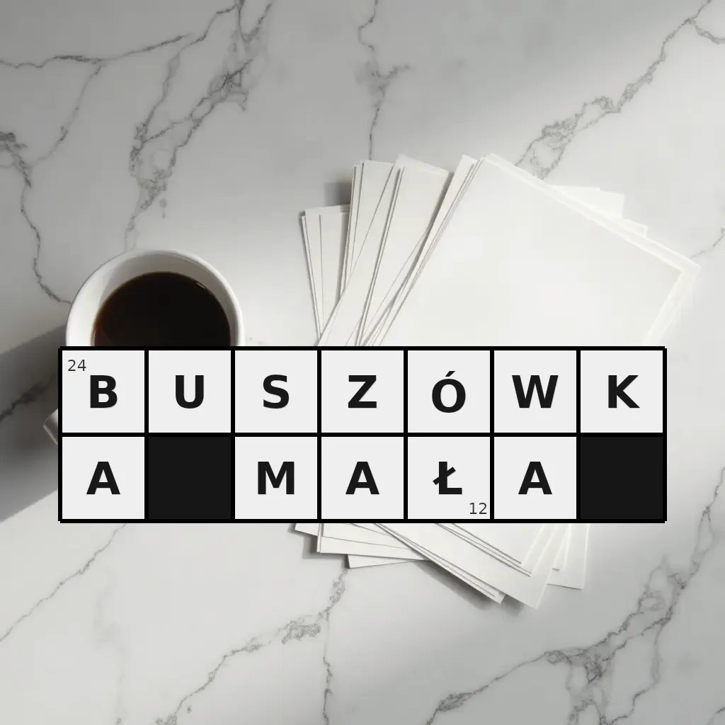 Słowo „buszówka mała” ma 12 znaków (bez spacji i łączników).