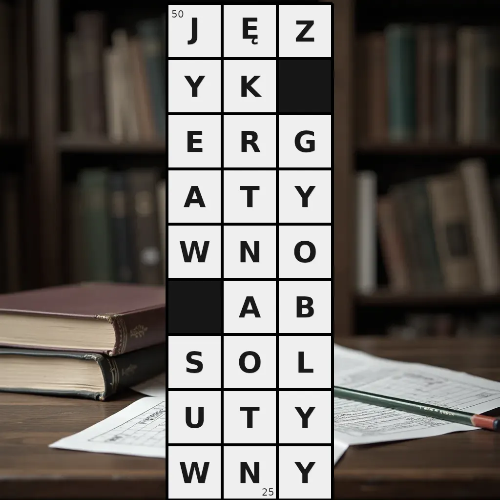 Zawiera litery: -, A, A, B, E, G, J, K, L, N, N, O, O, R, S, T, T, U, W, W, Y, Y, Y, Y, Z, Ę