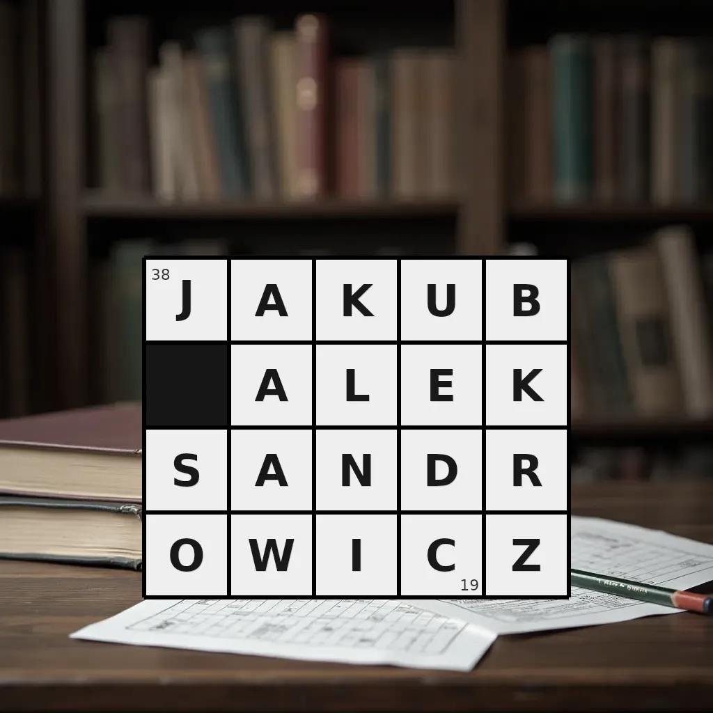 Słowo „jakub aleksandrowicz” ma 19 znaków (bez spacji i łączników).