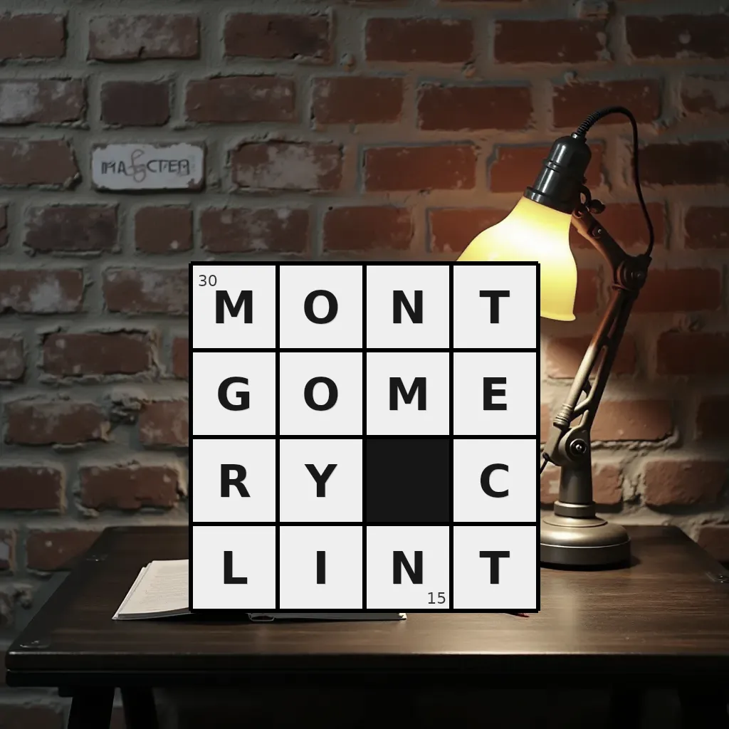 Słowo „montgomery clint” ma 15 znaków (bez spacji i łączników).