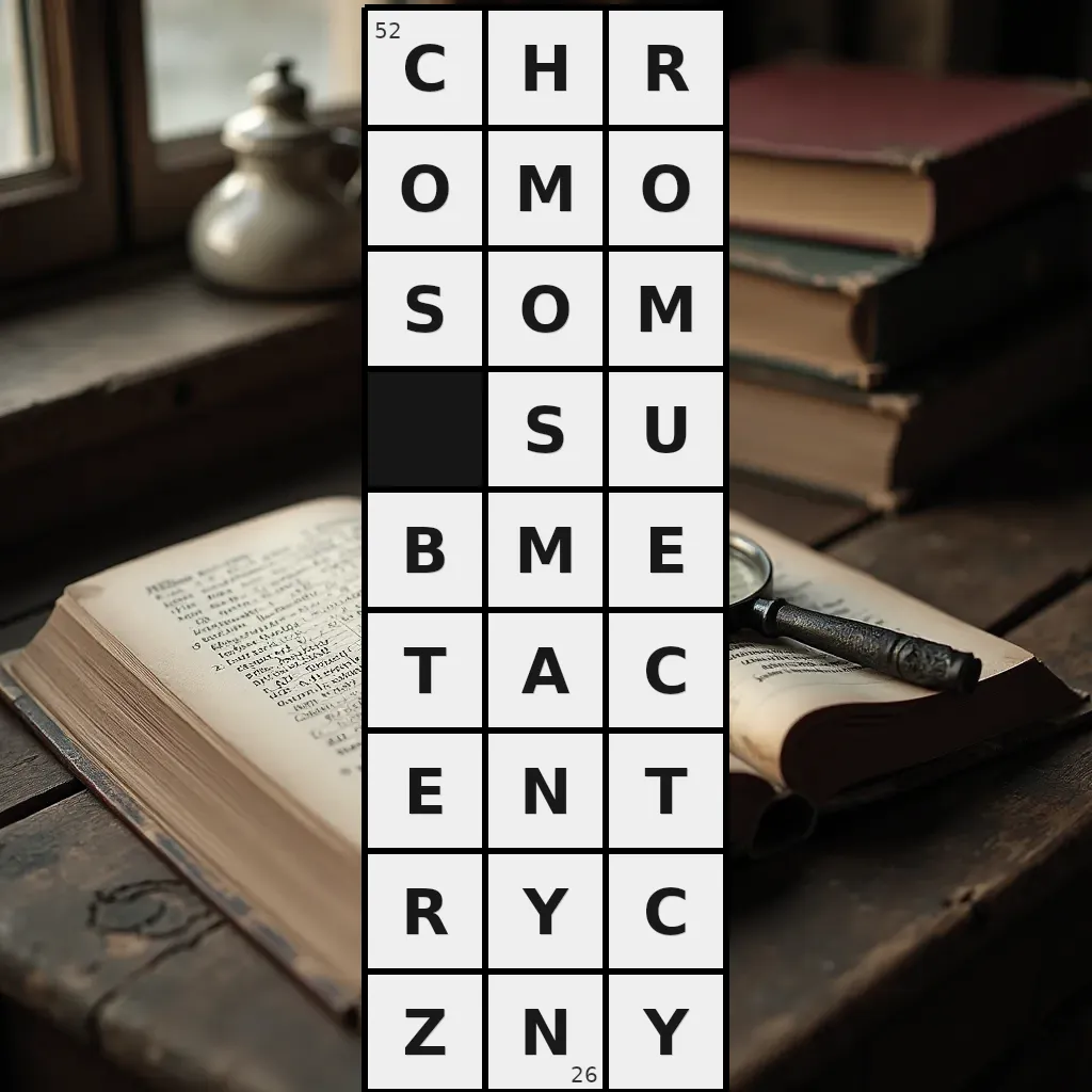 Słowo „chromosom submetacentryczny” ma 26 znaków (bez spacji i łączników).