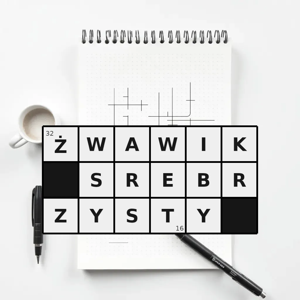 Słowo „żwawik srebrzysty” ma 16 znaków (bez spacji i łączników).