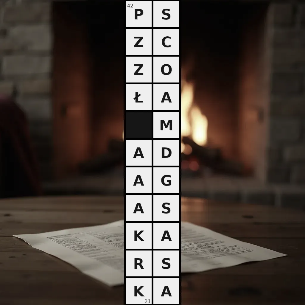 Zawiera litery: A, A, A, A, A, A, C, D, G, K, K, M, O, P, R, S, S, S, Z, Z, Ł