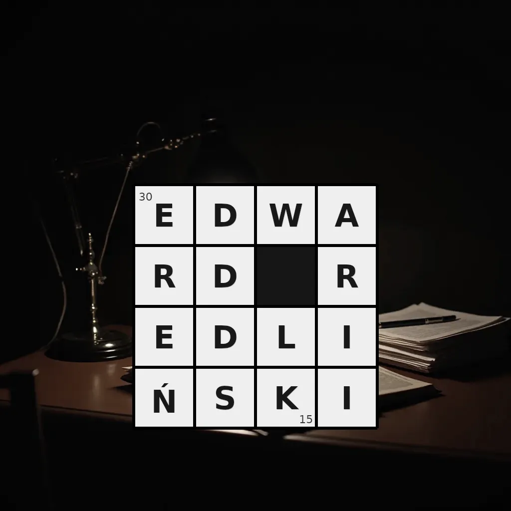 Słowo „edward redliński” ma 15 znaków (bez spacji i łączników).