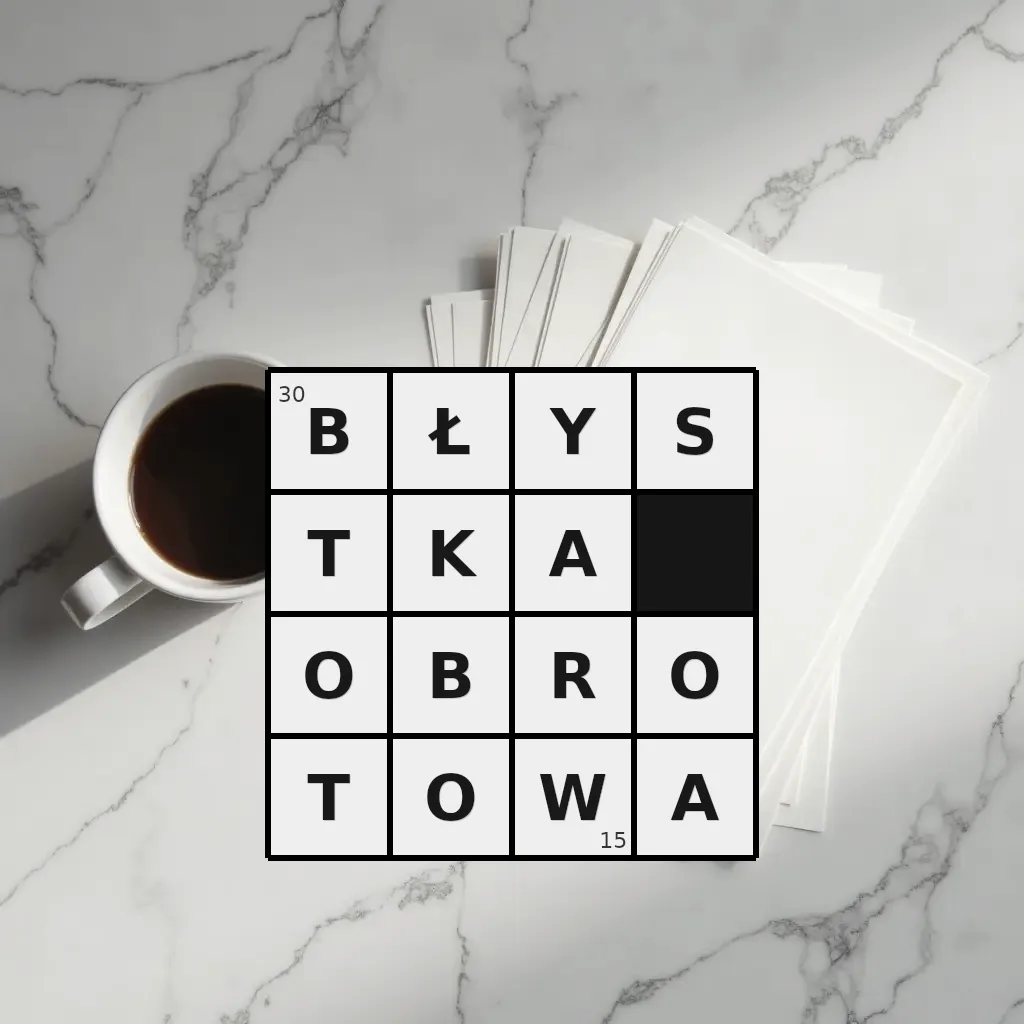 Słowo „błystka obrotowa” ma 15 znaków (bez spacji i łączników).