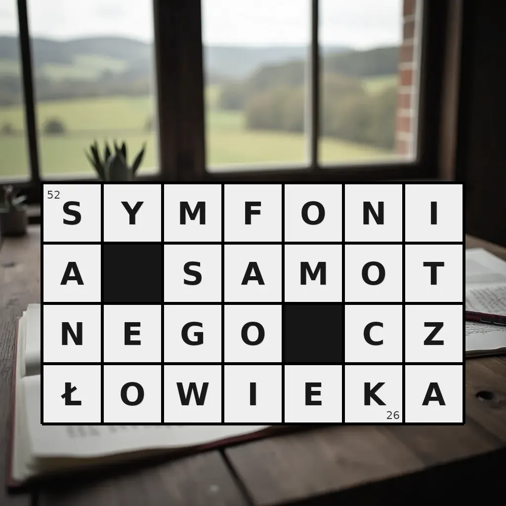 Słowo „symfonia samotnego człowieka” ma 26 znaków (bez spacji i łączników).