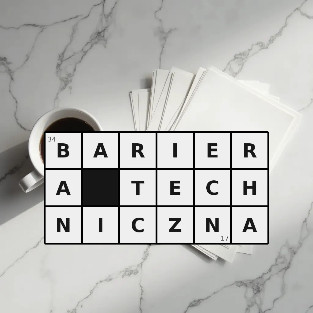 Słowo „bariera techniczna” ma 17 znaków (bez spacji i łączników).