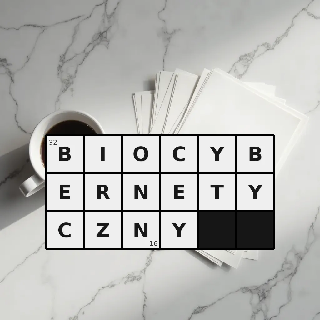 Słowo „biocybernetyczny” ma 16 znaków (bez spacji i łączników).