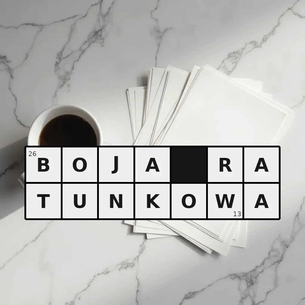 Zawiera litery: A, A, A, B, J, K, N, O, O, R, T, U, W