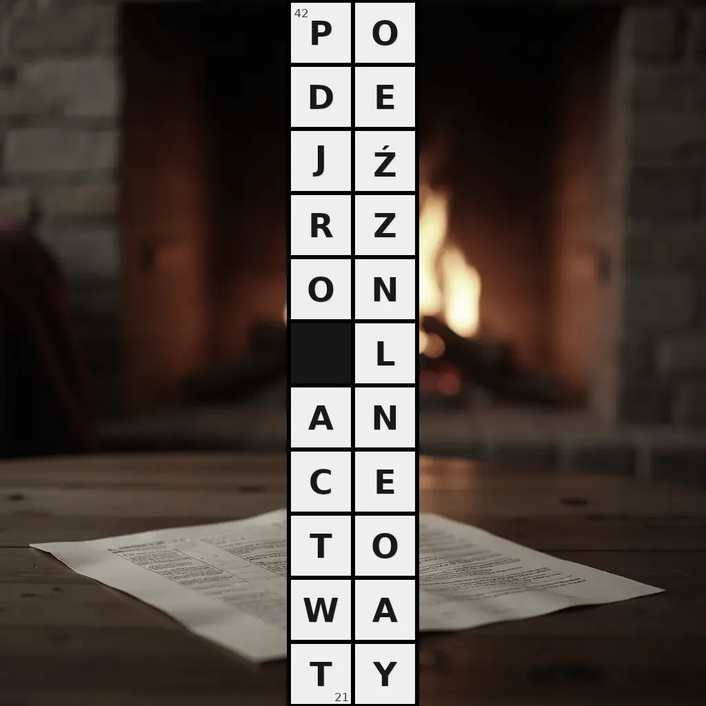 Zawiera litery: A, A, C, D, E, E, J, L, N, N, O, O, O, P, R, T, T, W, Y, Z, Ź