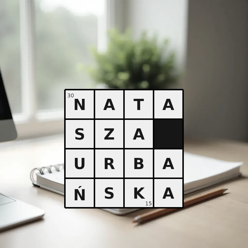 Słowo „natasza urbańska” ma 15 znaków (bez spacji i łączników).
