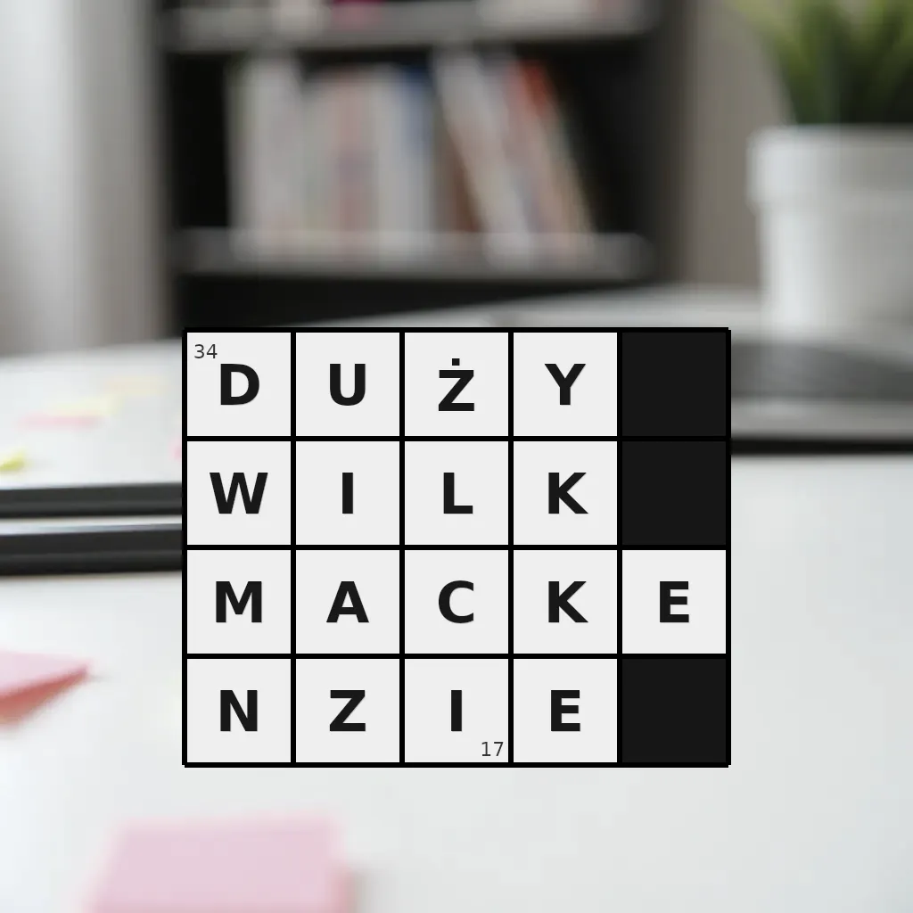 Słowo „duży wilk mackenzie” ma 17 znaków (bez spacji i łączników).