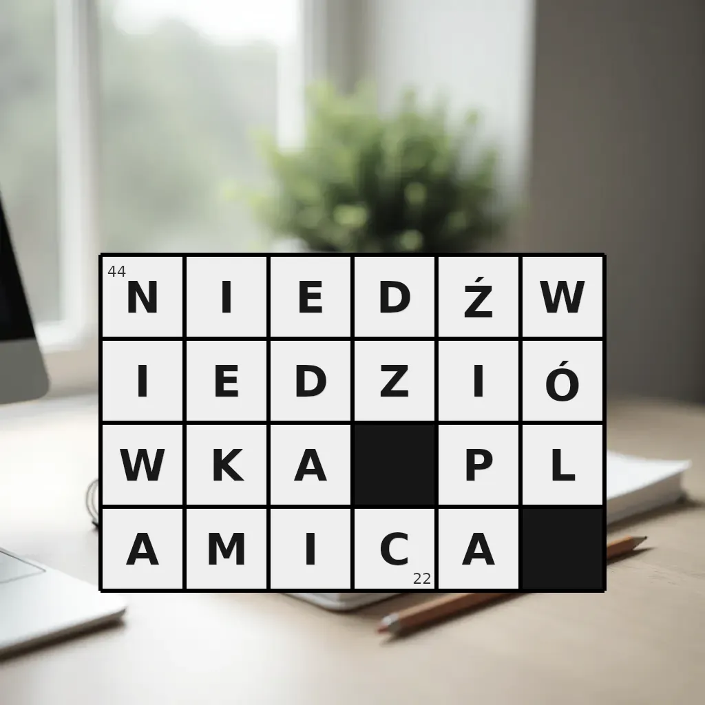 Słowo „niedźwiedziówka plamica” ma 22 znaki (bez spacji i łączników).