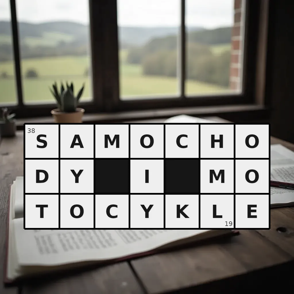 Słowo „samochody i motocykle” ma 19 znaków (bez spacji i łączników).