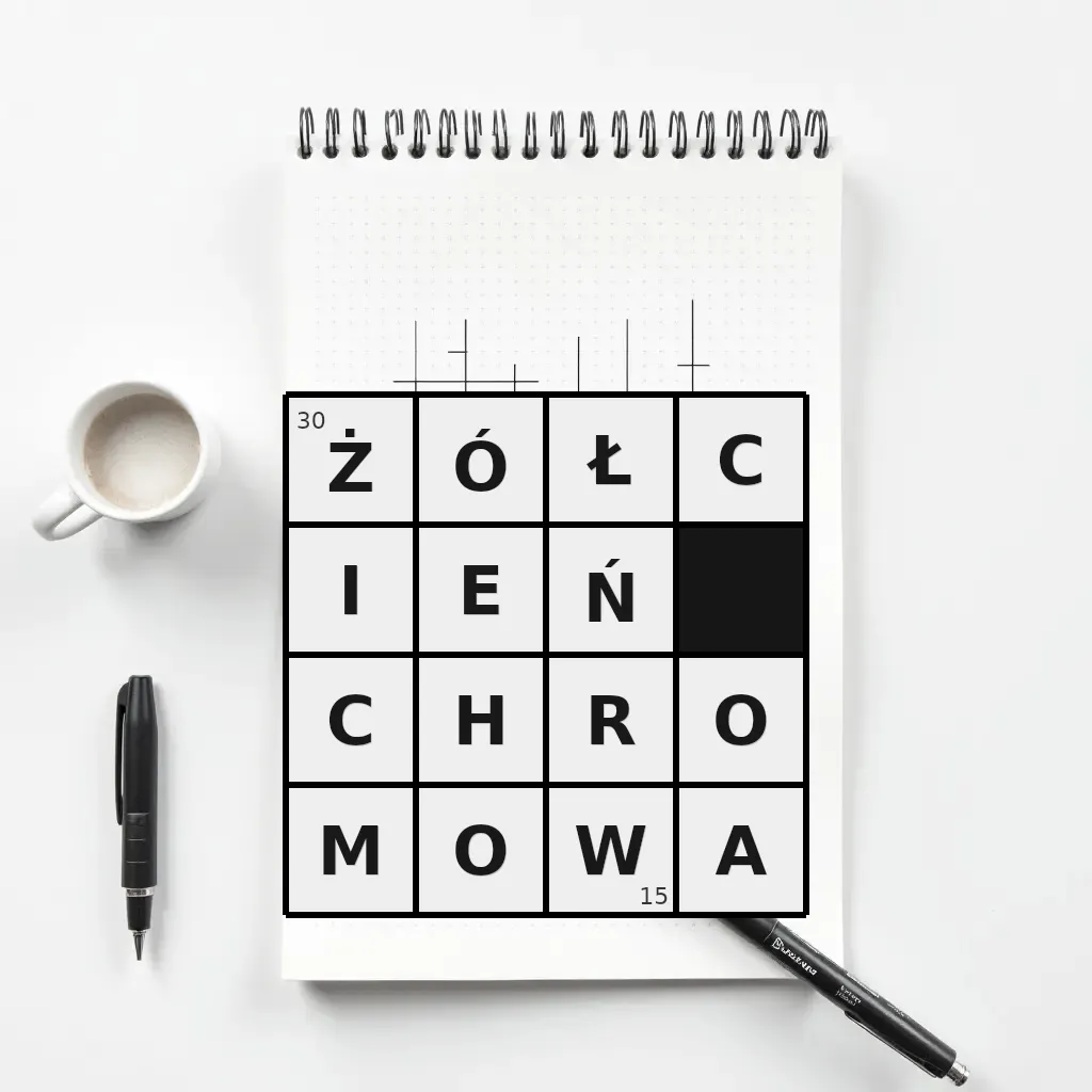 Słowo „żółcień chromowa” ma 15 znaków (bez spacji i łączników).