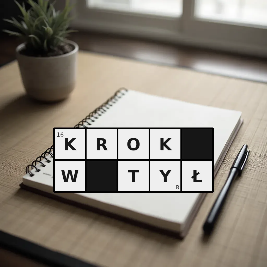Słowo „krok w tył” ma 8 znaków (bez spacji i łączników).
