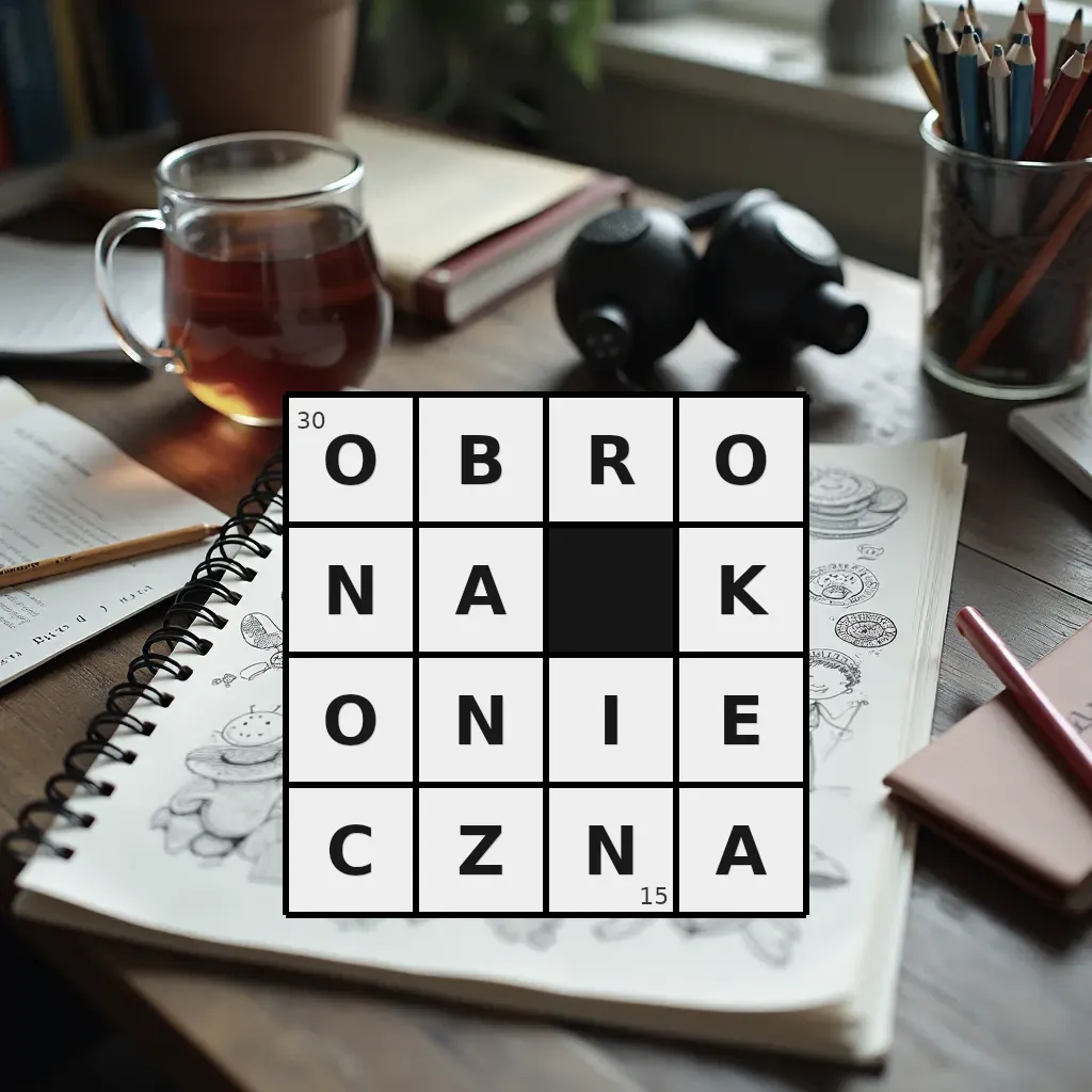 Słowo „obrona konieczna” ma 15 znaków (bez spacji i łączników).