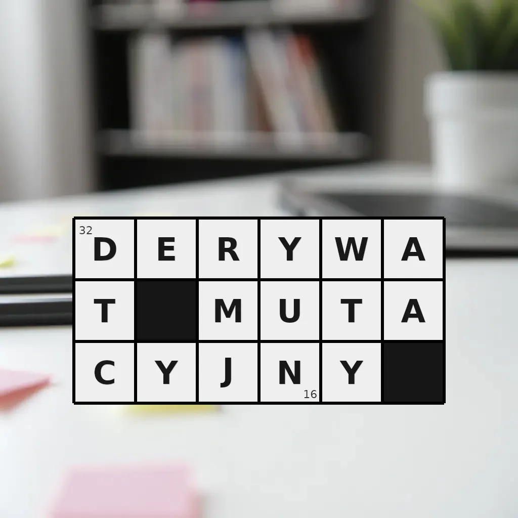 Zawiera litery: A, A, C, D, E, J, M, N, R, T, T, U, W, Y, Y, Y