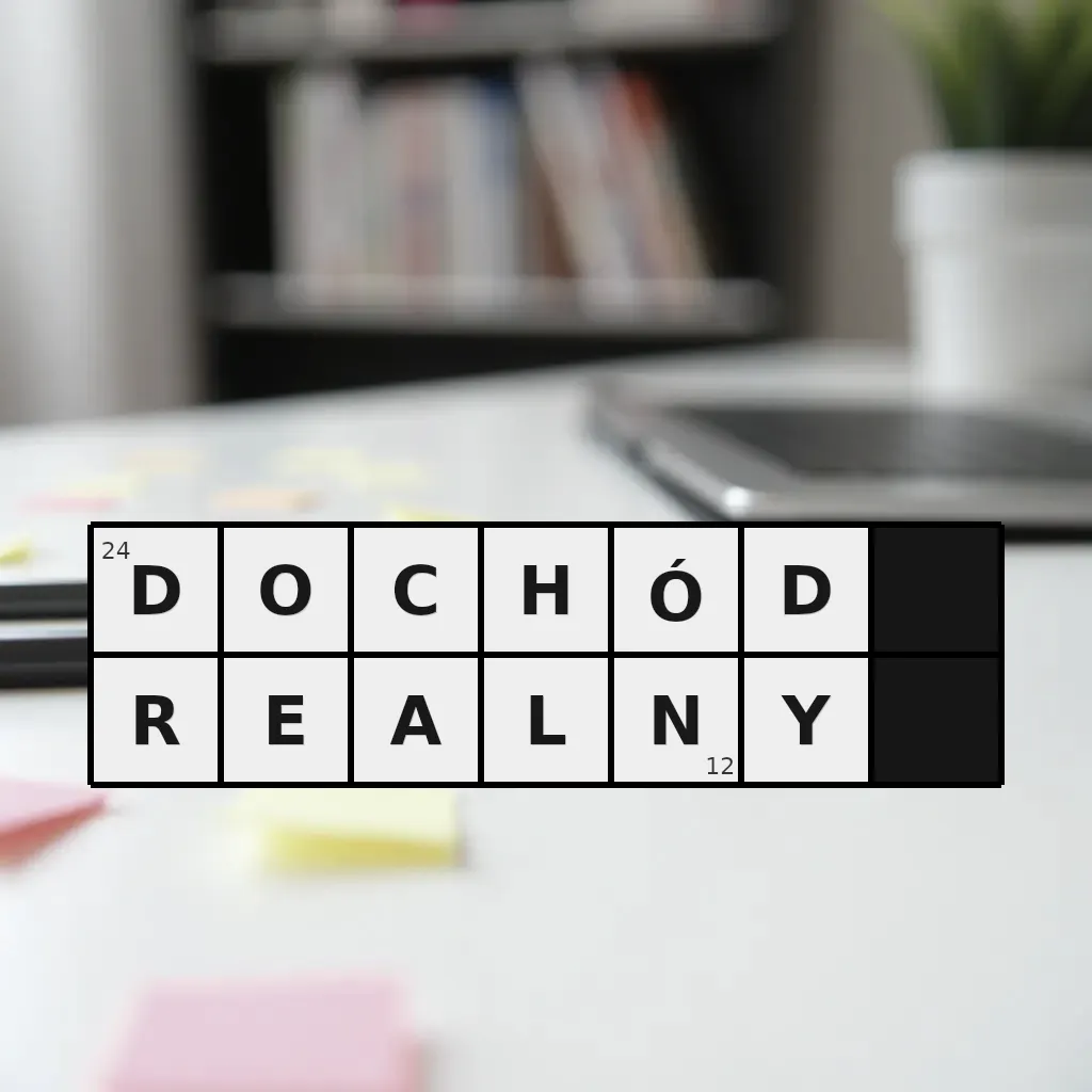 Słowo „dochód realny” ma 12 znaków (bez spacji i łączników).