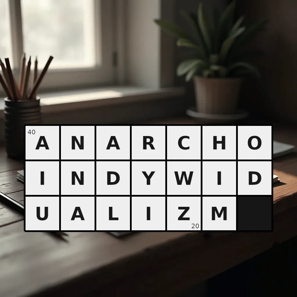 Słowo „anarchoindywidualizm” ma 20 znaków (bez spacji i łączników).