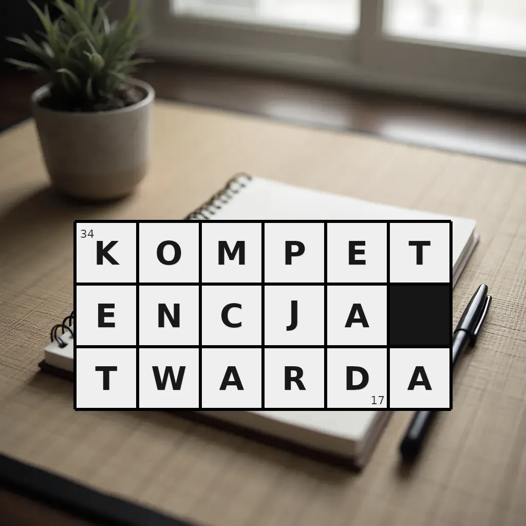 Słowo „kompetencja twarda” ma 17 znaków (bez spacji i łączników).