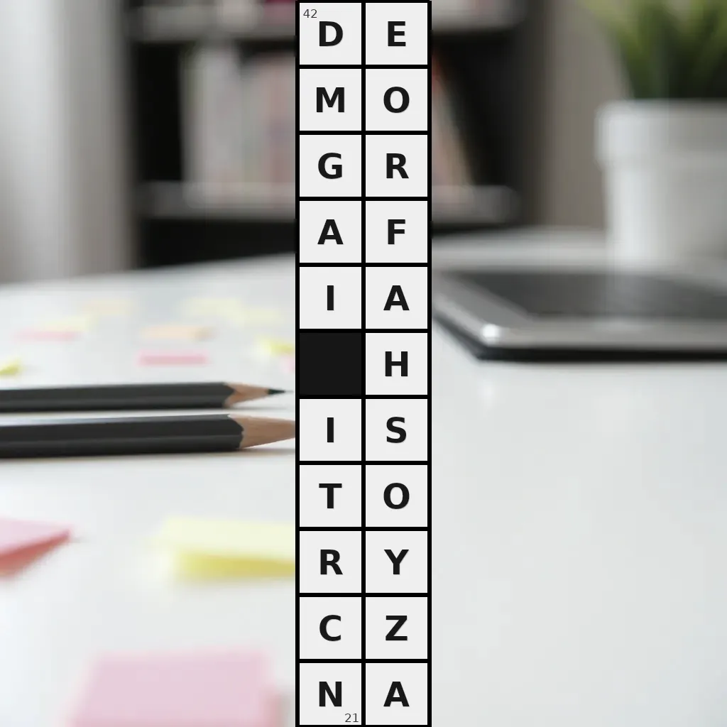 Słowo „demografia historyczna” ma 21 znak (bez spacji i łączników).