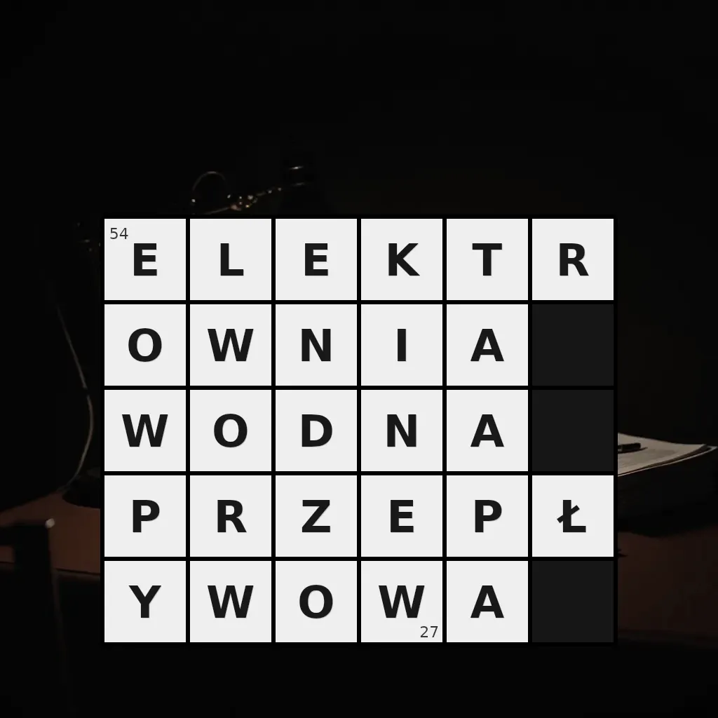 Słowo „elektrownia wodna przepływowa” ma 27 znaków (bez spacji i łączników).