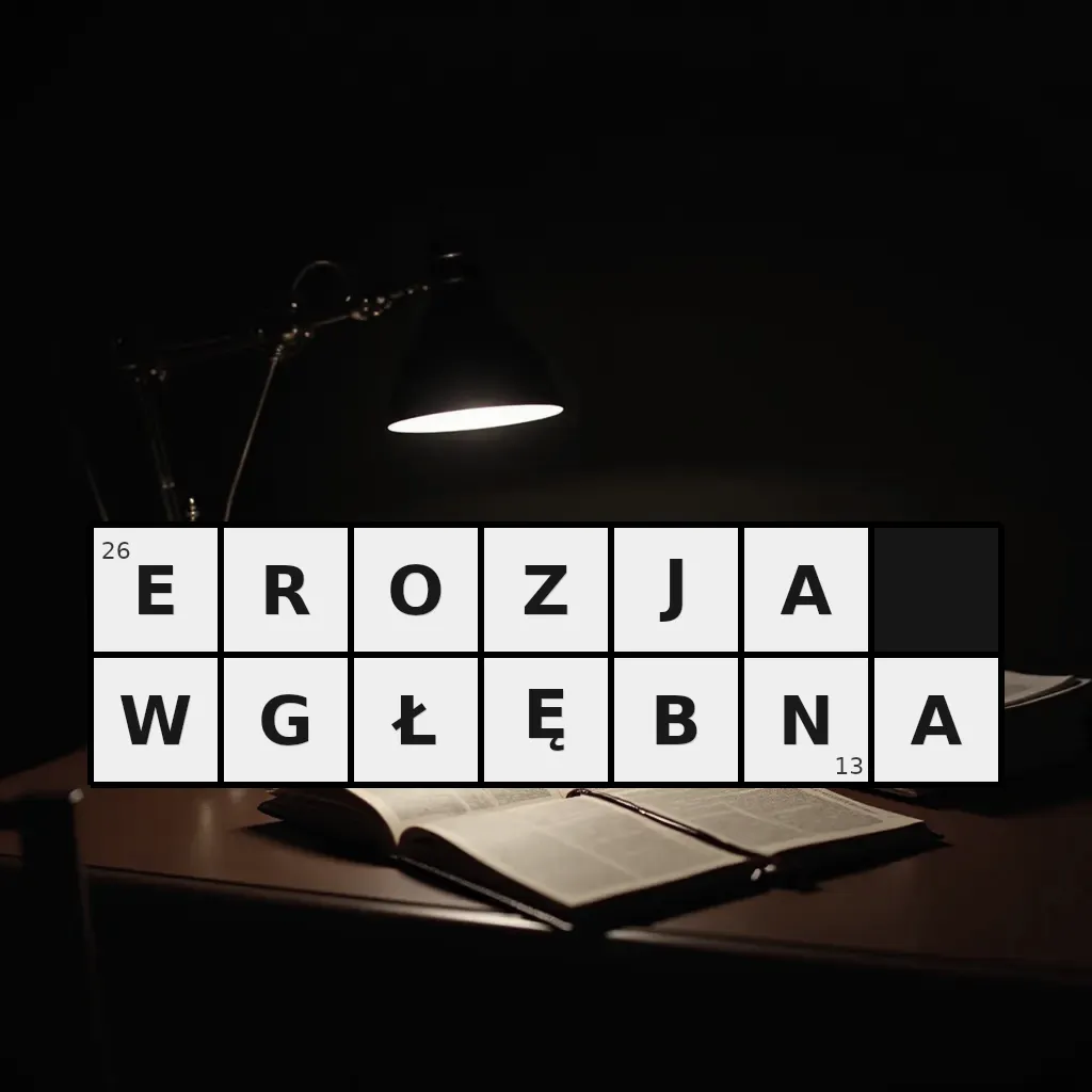 Słowo „erozja wgłębna” ma 13 znaków (bez spacji i łączników).