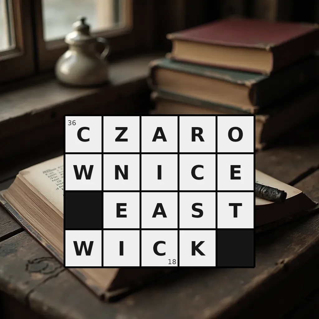 Słowo „czarownice eastwick” ma 18 znaków (bez spacji i łączników).