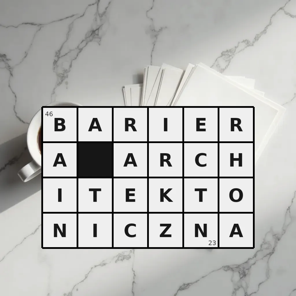 Słowo „bariera architektoniczna” ma 23 znaki (bez spacji i łączników).