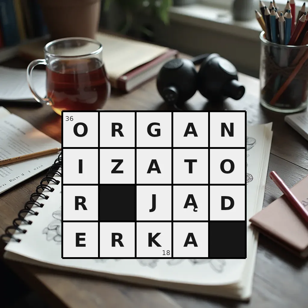 Słowo „organizator jąderka” ma 18 znaków (bez spacji i łączników).