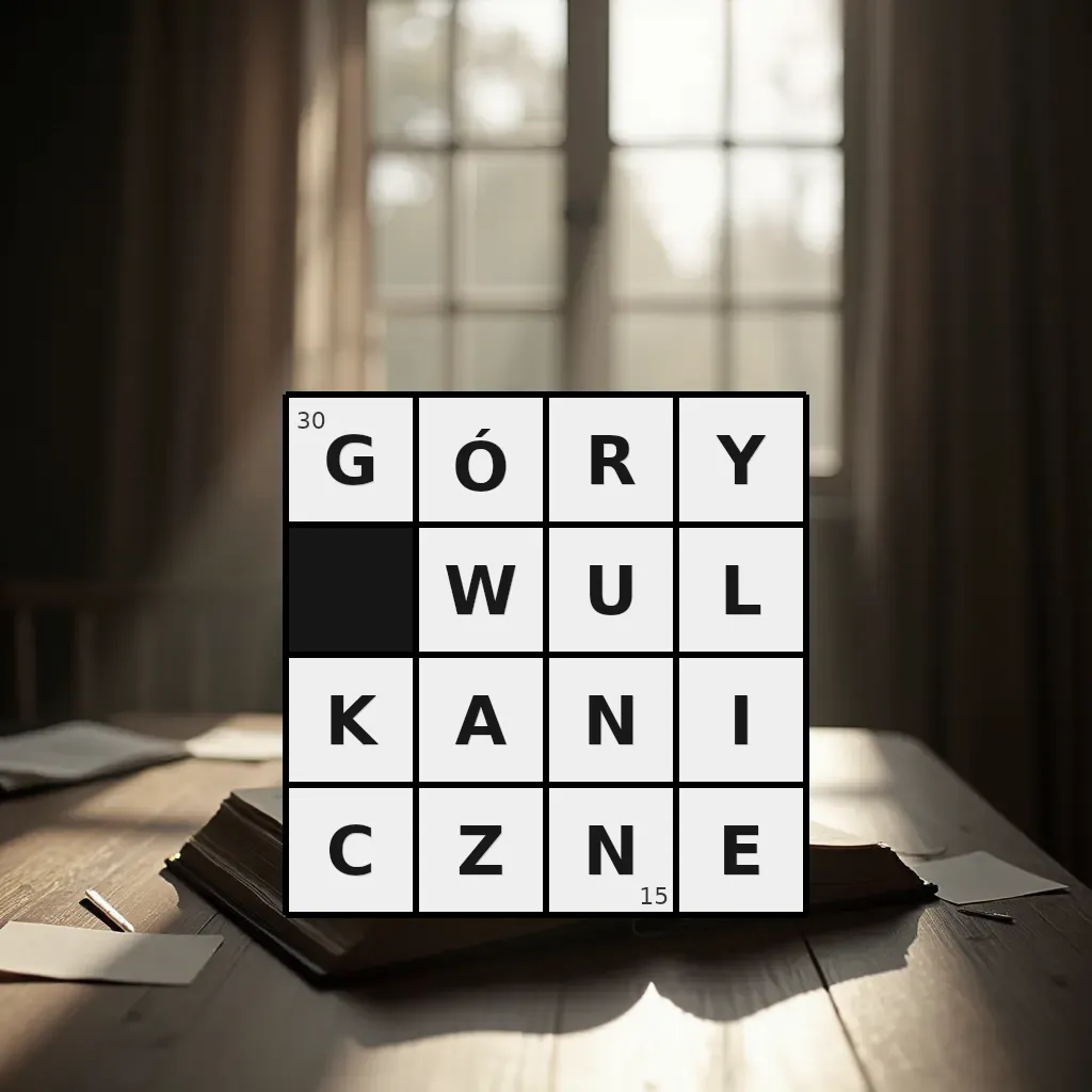 Słowo „góry wulkaniczne” ma 15 znaków (bez spacji i łączników).