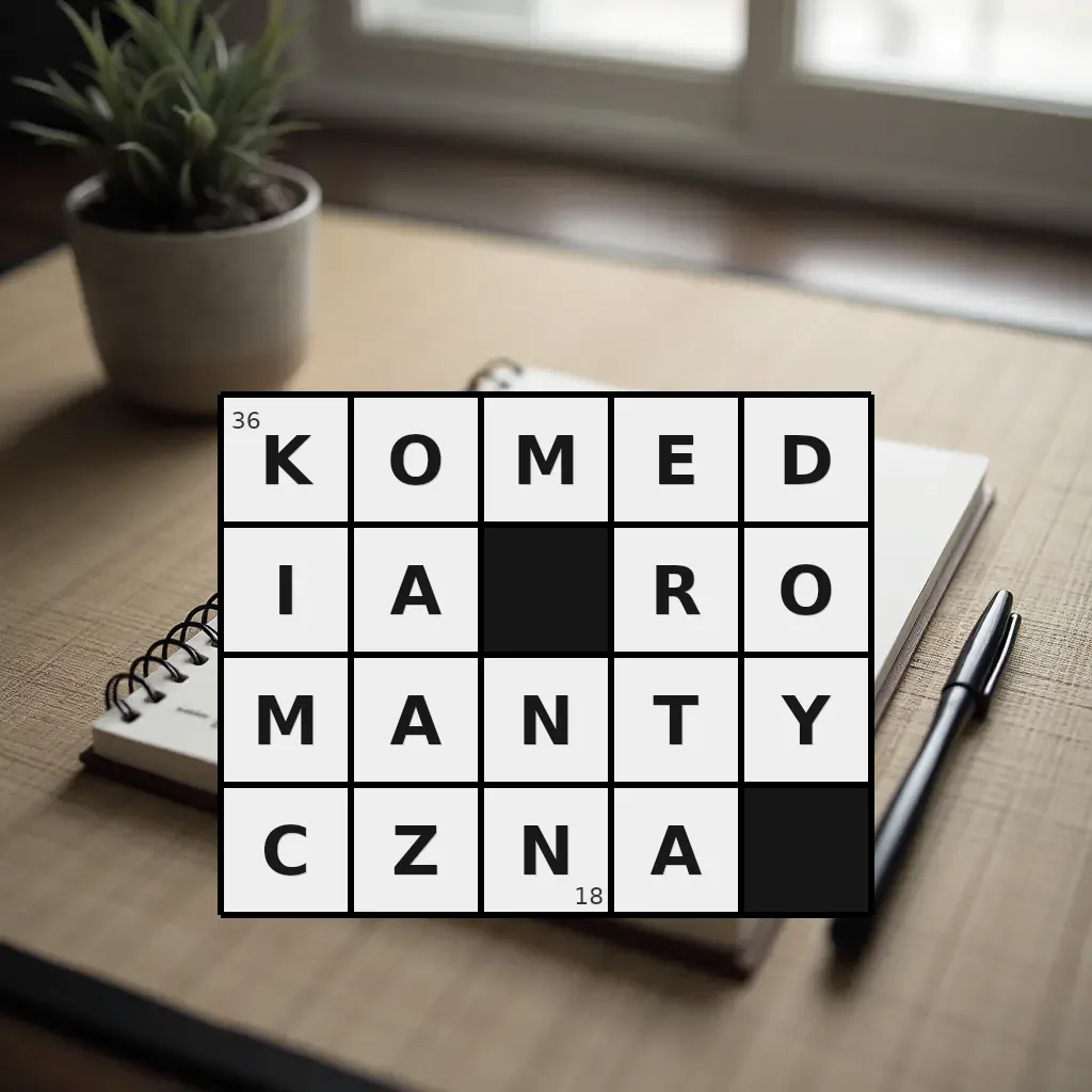 Słowo „komedia romantyczna” ma 18 znaków (bez spacji i łączników).
