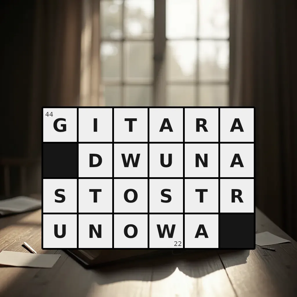 Słowo „gitara dwunastostrunowa” ma 22 znaki (bez spacji i łączników).