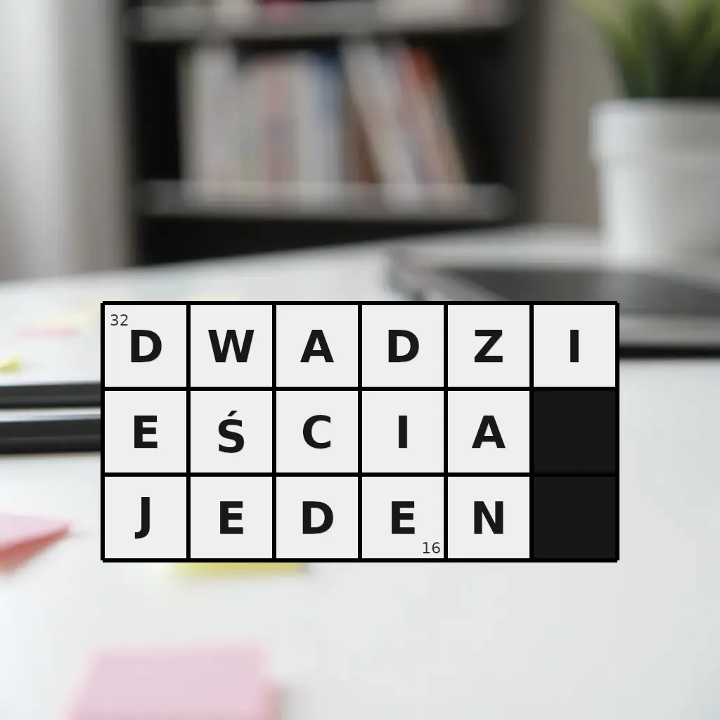 Słowo „dwadzieścia jeden” ma 16 znaków (bez spacji i łączników).