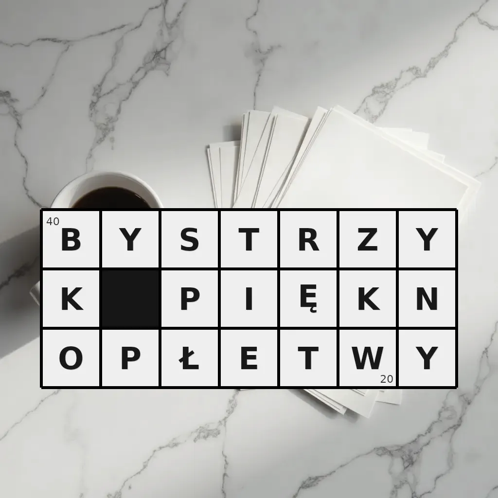 Słowo „bystrzyk pięknopłetwy” ma 20 znaków (bez spacji i łączników).
