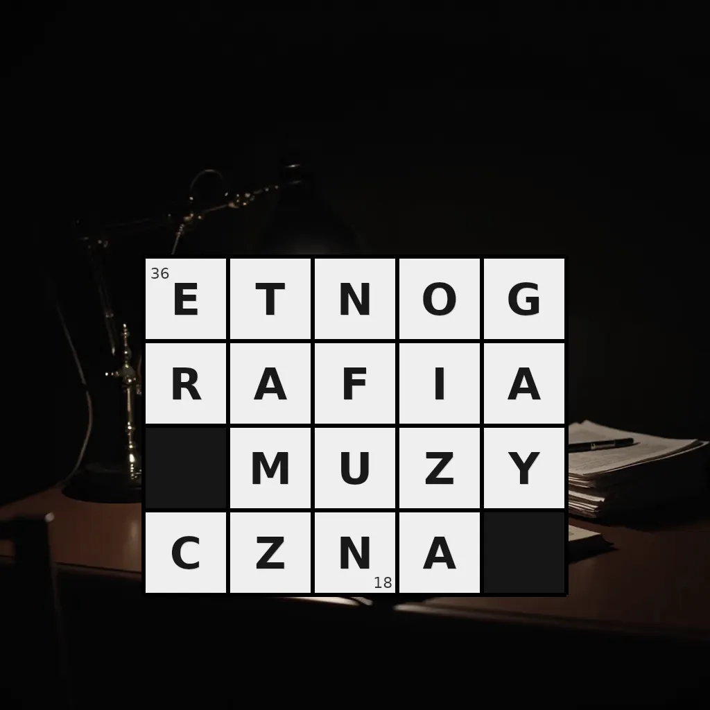Słowo „etnografia muzyczna” ma 18 znaków (bez spacji i łączników).