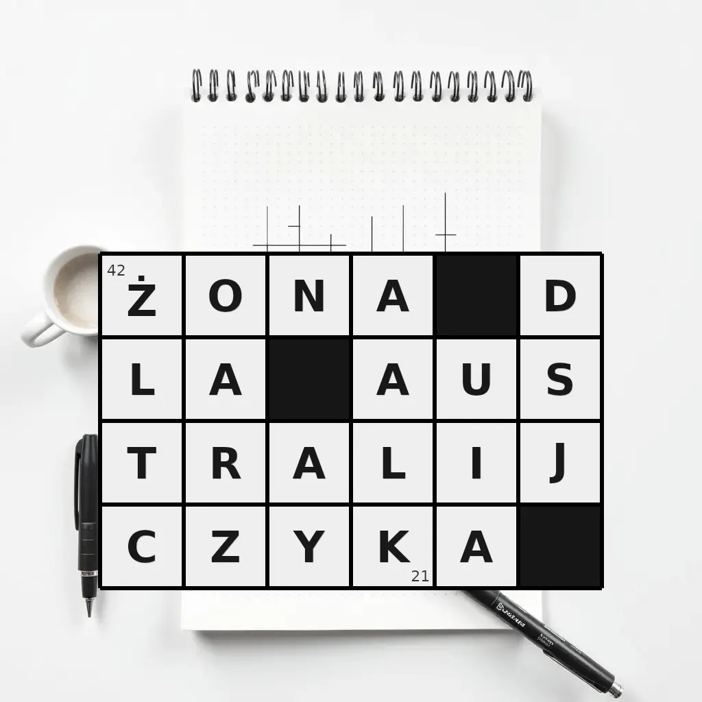 Słowo „żona dla australijczyka” ma 21 znak (bez spacji i łączników).