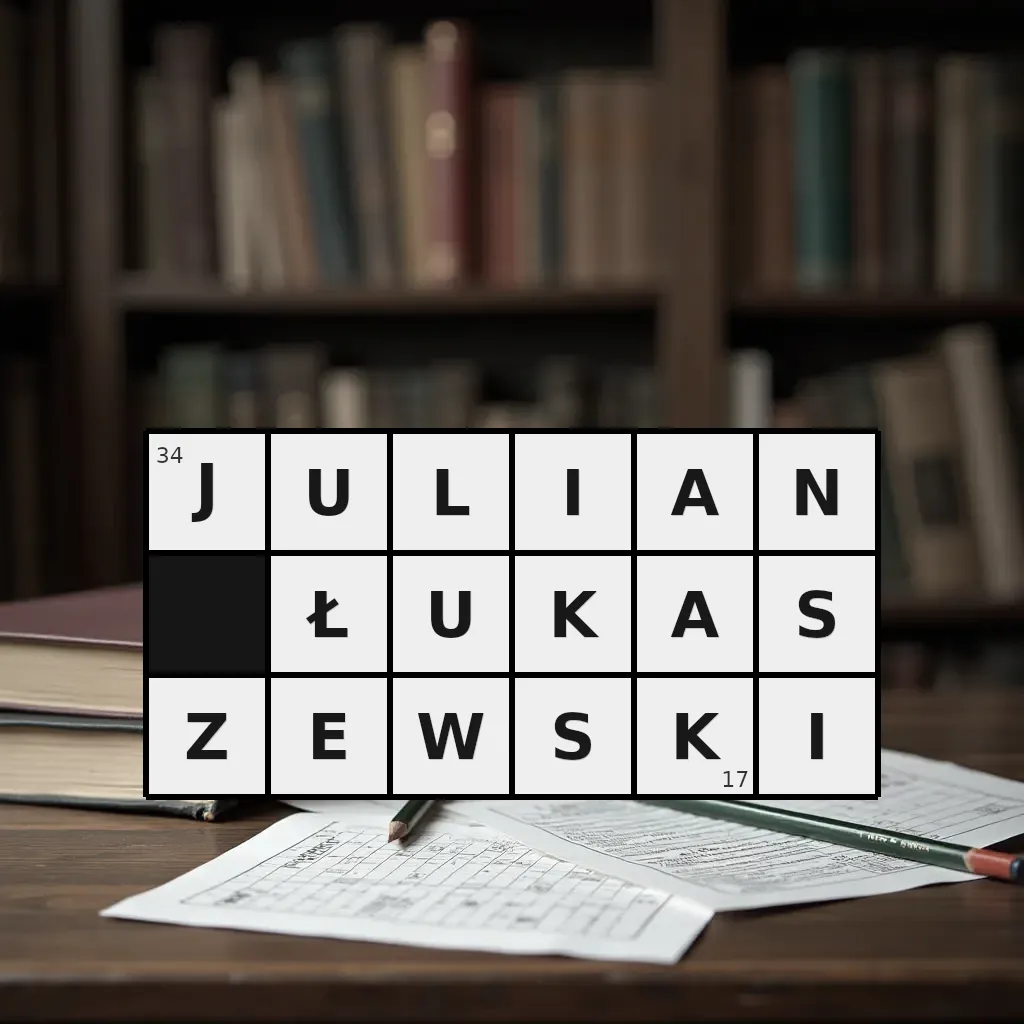 Słowo „julian łukaszewski” ma 17 znaków (bez spacji i łączników).