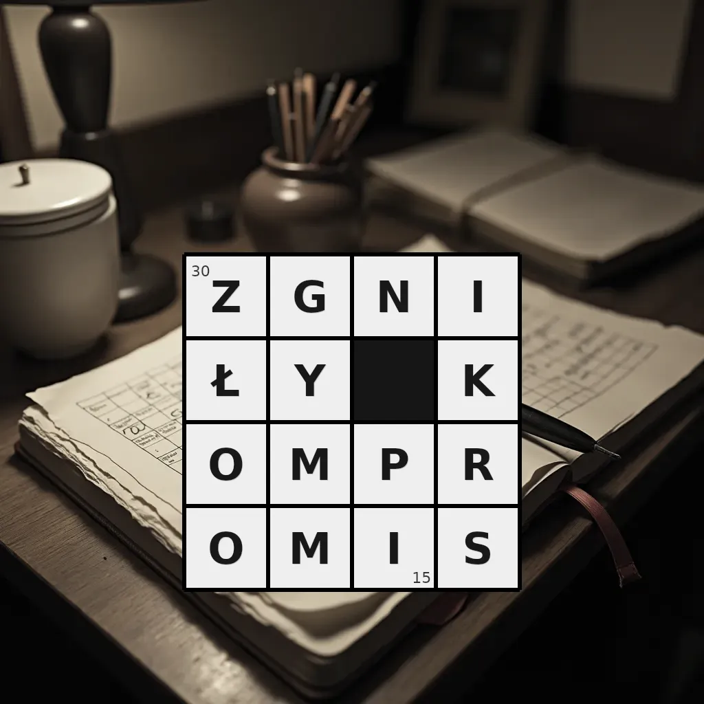Słowo „zgniły kompromis” ma 15 znaków (bez spacji i łączników).