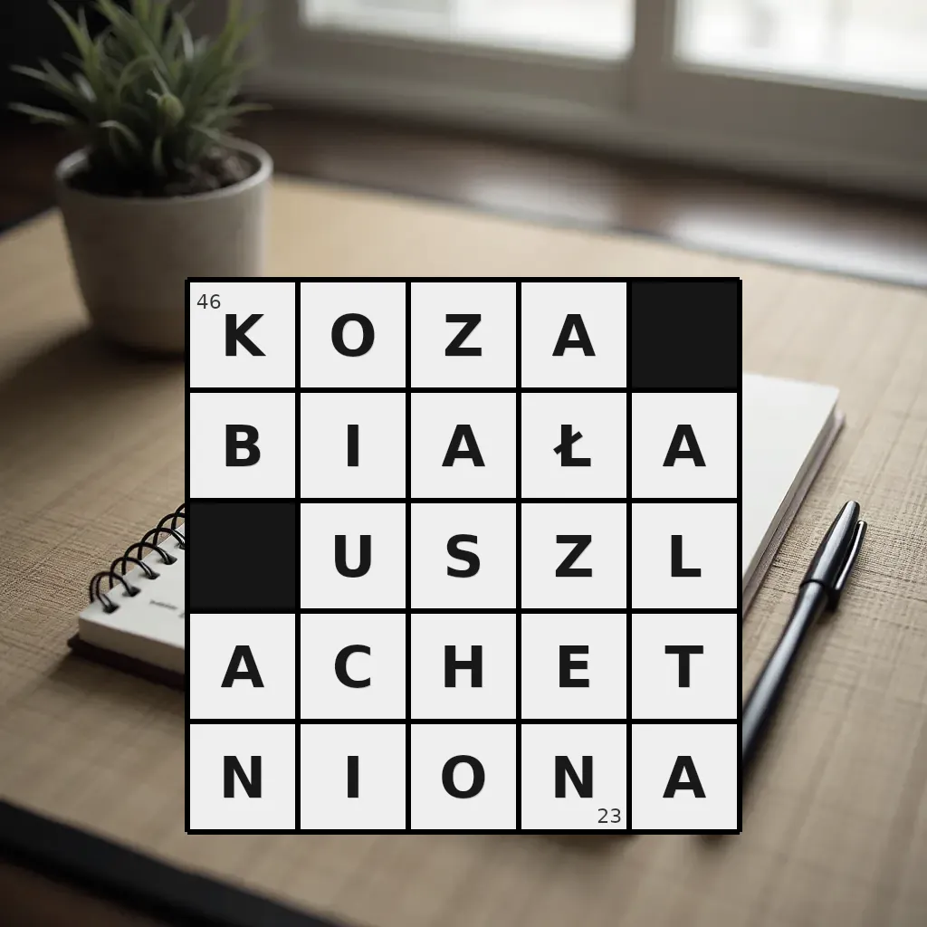 Słowo „koza biała uszlachetniona” ma 23 znaki (bez spacji i łączników).
