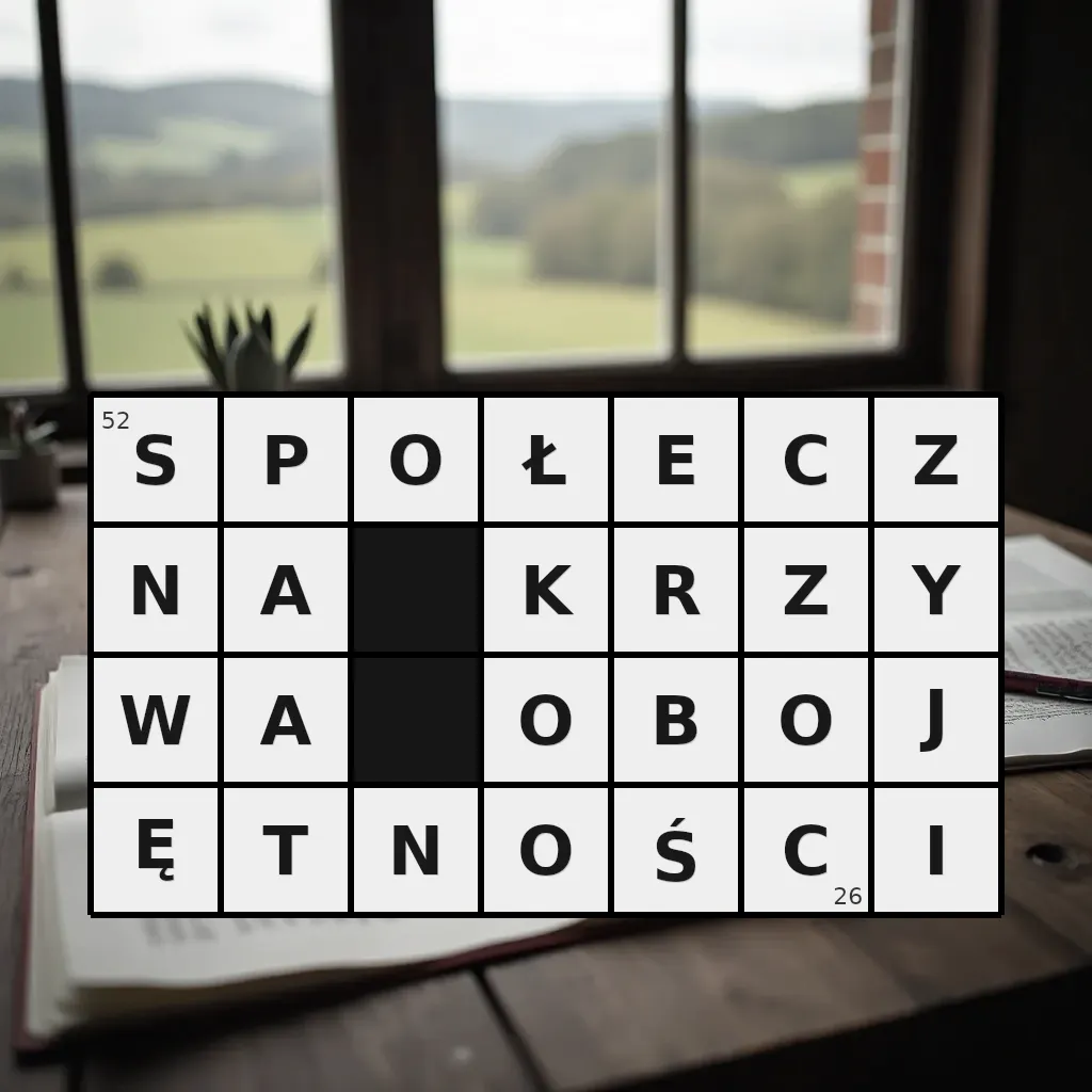 Słowo „społeczna krzywa obojętności” ma 26 znaków (bez spacji i łączników).