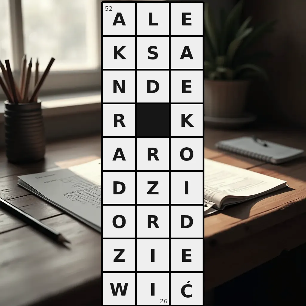 Słowo „aleksander karodziordziewić” ma 26 znaków (bez spacji i łączników).