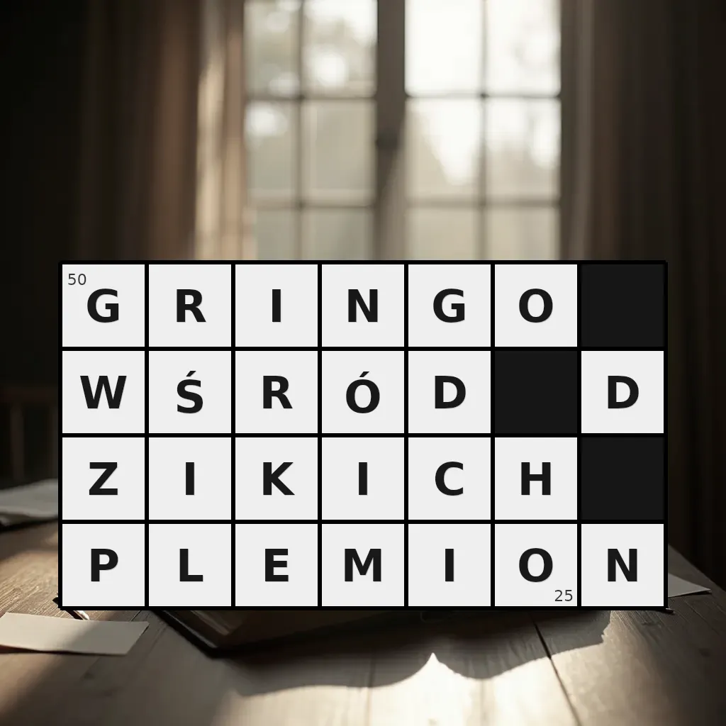 Słowo „gringo wśród dzikich plemion” ma 25 znaków (bez spacji i łączników).