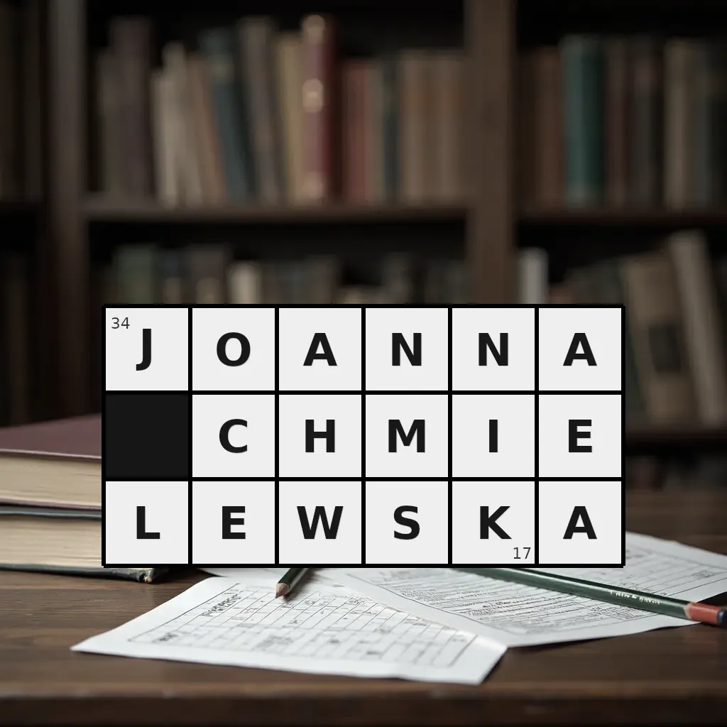 Słowo „joanna chmielewska” ma 17 znaków (bez spacji i łączników).