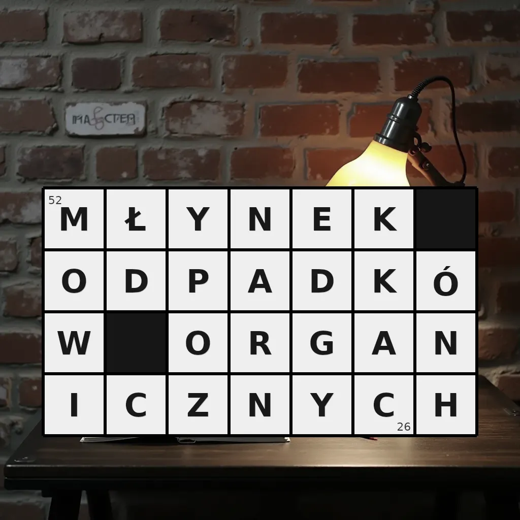 Słowo „młynek odpadków organicznych” ma 26 znaków (bez spacji i łączników).